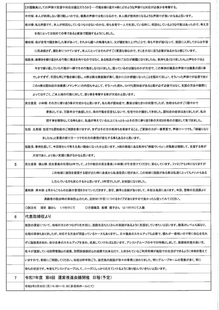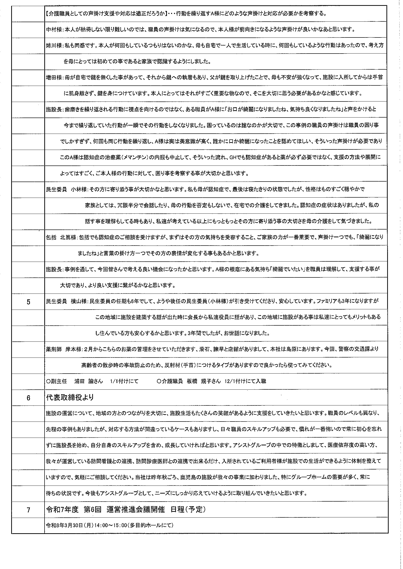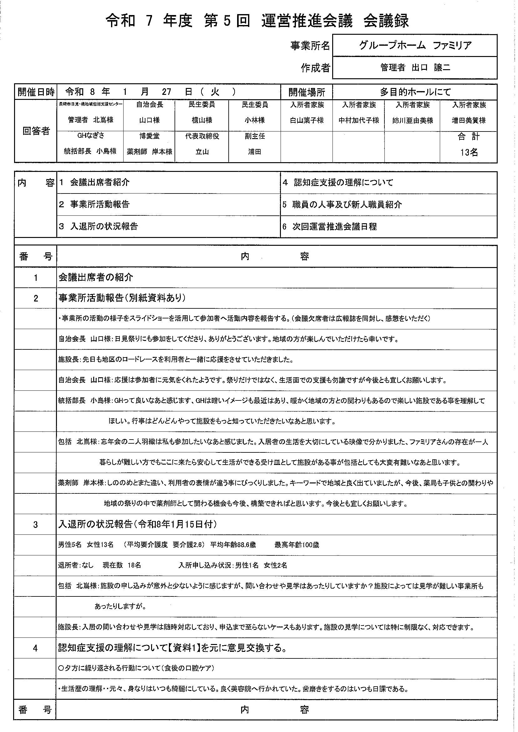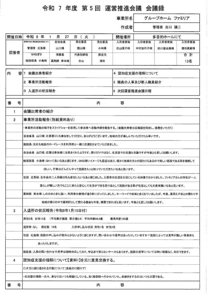 令和7年度第5回運営推進会議を開催いたしました 2026.02.02 令和8年1月27日(火)に令和7年度第5回運営推進会議を開催いたしました。(※画像をクリックで拡大します。) 令和7年度第4回運営推進会議を開催いたしました 前の記事 『高齢者虐待防止対応マニュアルを掲載いたします。』 次の記事